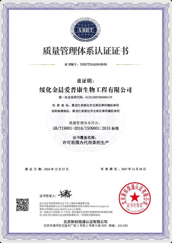 綏化金晨愛普康生物工程有限公司位于黑龍江省中南部地區(qū)的綏化市北林區(qū),所處位置東經(jīng)124度,北緯45度,位于松嫩平原的呼蘭河流域,“有寒地黑土,塞北江南”的美譽,是全國重要的商品糧基地,屬中溫帶大陸性季風(fēng)氣候,四季分明,雨熱同期,冬季冰雪覆蓋,夏季降雨集中氣候溫?zé)釢駶櫋=椈鸪繍燮湛瞪锕こ逃邢薰臼且患覍I(yè)從事健康養(yǎng)生產(chǎn)品研發(fā)、生產(chǎn)及銷售企業(yè),公司占地總面積8000平方米,建筑面積5000平方米,公司周圍無任何污染源,是食品生產(chǎn)基地。公司生產(chǎn)車間潔凈度級別達到10萬級,同時擁有數(shù)十臺先進的生產(chǎn)設(shè)備及高科技檢驗儀器,從產(chǎn)品的原輔料、中間品、成品到銷售的全過程嚴格把關(guān),使生產(chǎn)中每道工序都符合產(chǎn)品的高標(biāo)準要求,從而保證了公司生產(chǎn)的每一袋產(chǎn)品合格,無質(zhì)量缺陷。綏化金晨愛普康生物工程有限公司率先采用了企業(yè)資源ERP管理系統(tǒng),肩負著養(yǎng)生產(chǎn)業(yè)的重要課題,同時又是江蘇省國家藥用植物重點實驗中心科研成果轉(zhuǎn)化的生產(chǎn)試驗基地,公司核心成員均為本科以上學(xué)歷。生產(chǎn)的產(chǎn)品有近五十個品種的代用茶產(chǎn)品,公司先后通過HALAL國際認證,編號為SSPY-201318-33849;ISO9001質(zhì)量管理體系認證編號為XBH···